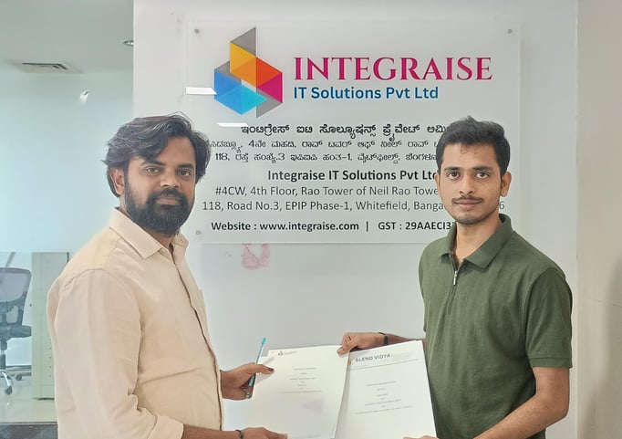 We are thrilled to announce that BlendVidya has signed a Memorandum of Understanding (MOU) with Integraise IT Solutions Pvt Ltd. company. This strategic partnership is designed to enhance the career prospects of our students and provide them with exciting opportunities.